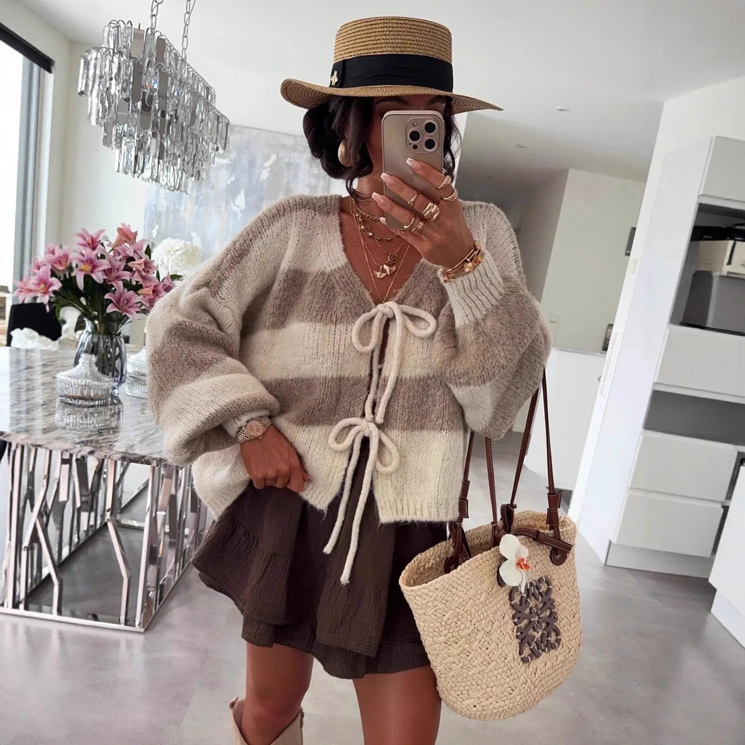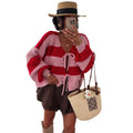 Step into the season with effortless elegance in this striped knit cardigan, designed to bring a refined yet cozy touch to your autumn and winter wardrobe. Featuring a flattering V-neckline, delicate crochet detailing, and a classic stripe pattern, this piece strikes the perfect balance between feminine charm and polished office style. The open-front design makes it easy to layer over blouses or dresses, creating a look that feels both professional and relaxed.