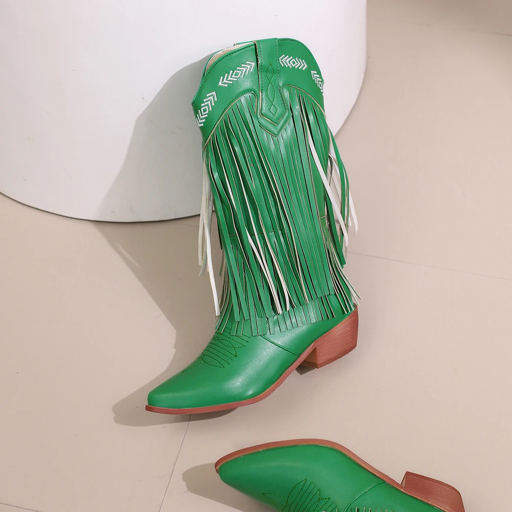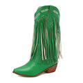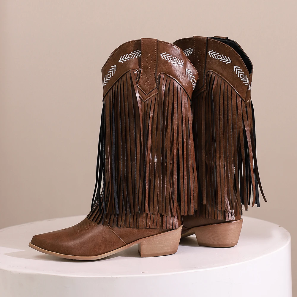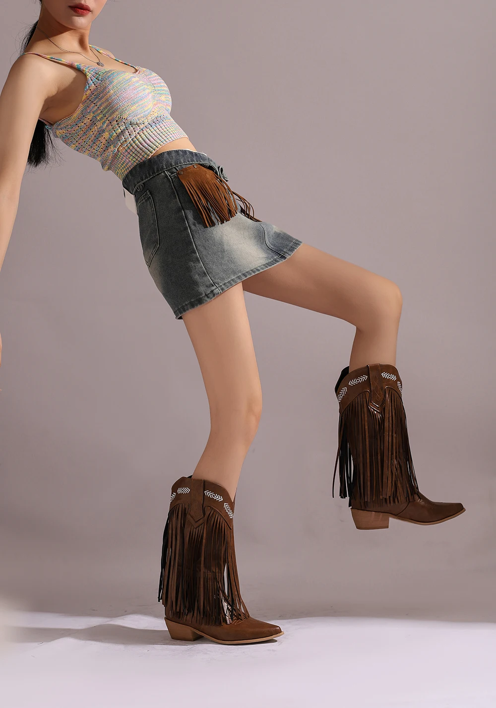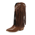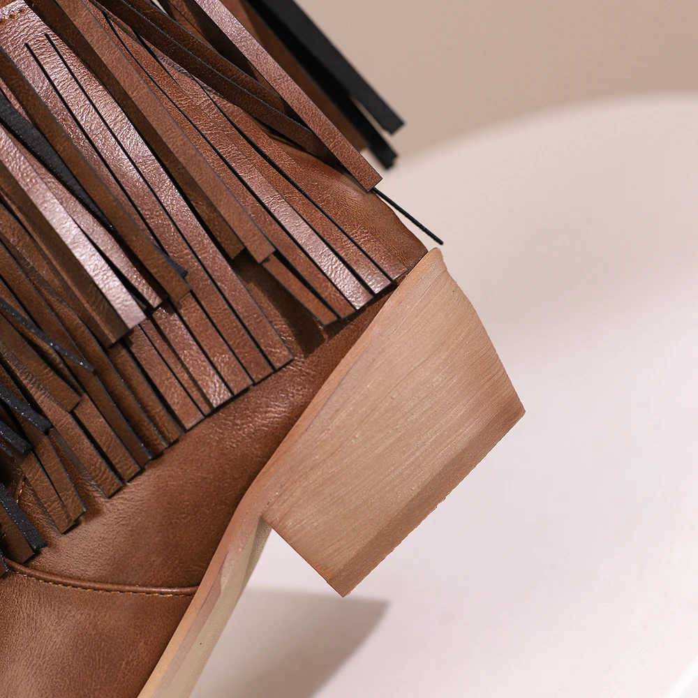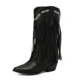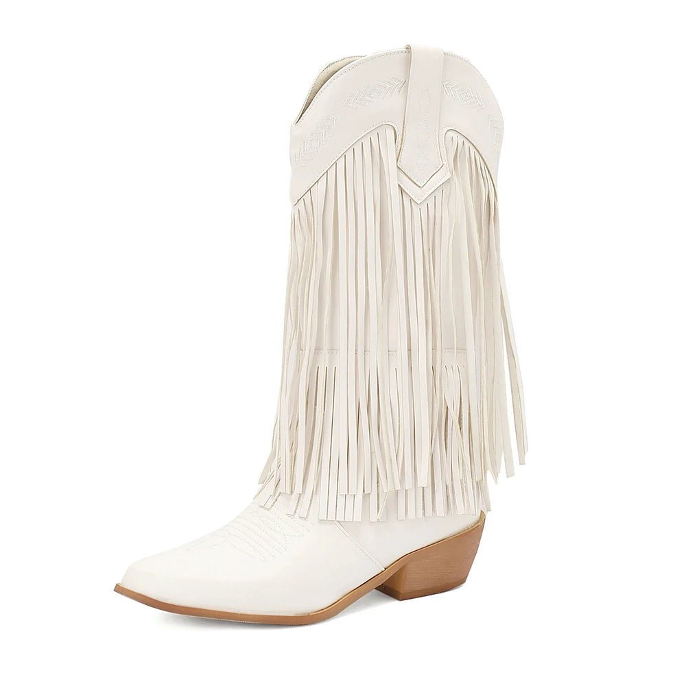 These retro-inspired mid-calf western boots feature a pointed toe, soft plush lining, and stylish fringe detailing for a standout winter look. Designed with a comfortable square heel and slip-on fit, they offer both fashion and warmth for everyday wear.