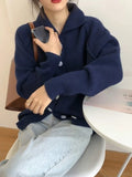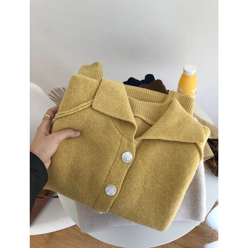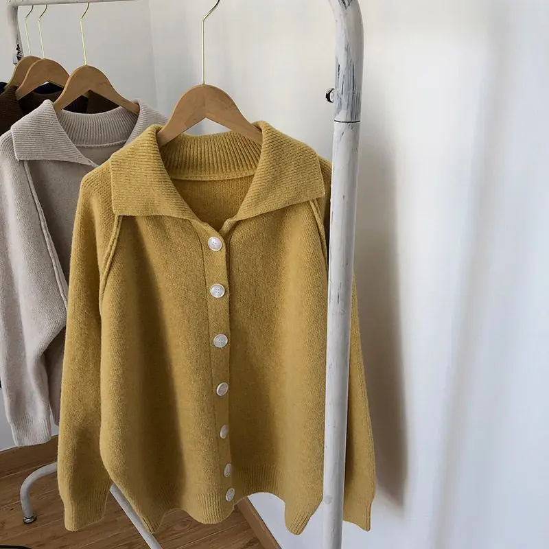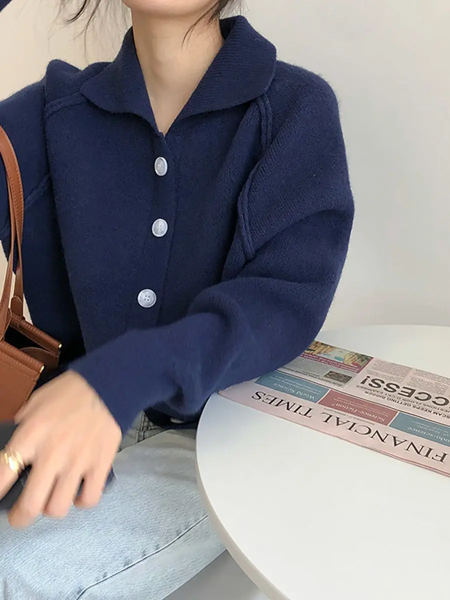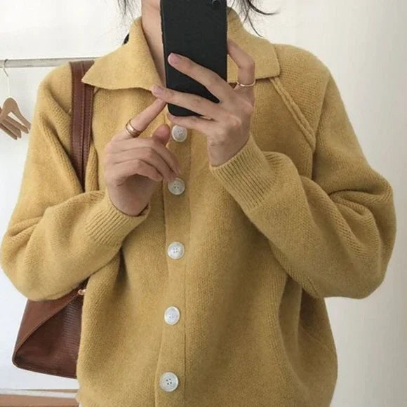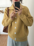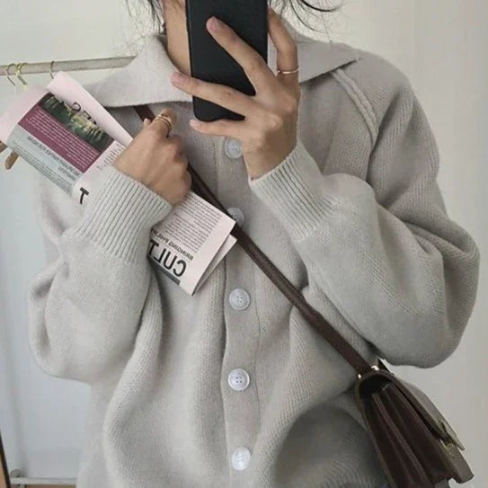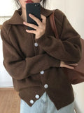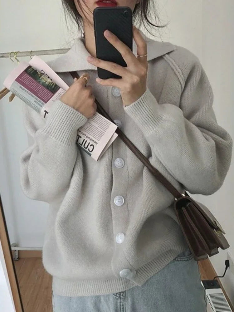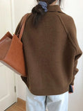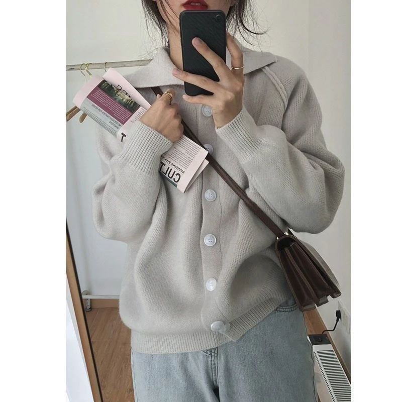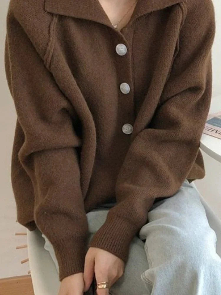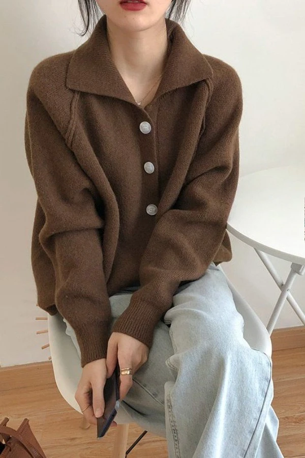Whether you’re heading to the office or enjoying a casual day out, this loose-fitting, solid-colored cardigan is your go-to for warmth and style. Its timeless turn-down collar and sleek, minimalist design bring a polished, sophisticated touch to any look, making it easy to pair with skirts, trousers, or jeans. Cozy, chic, and effortlessly versatile, this cardigan is a must-have for your seasonal wardrobe.