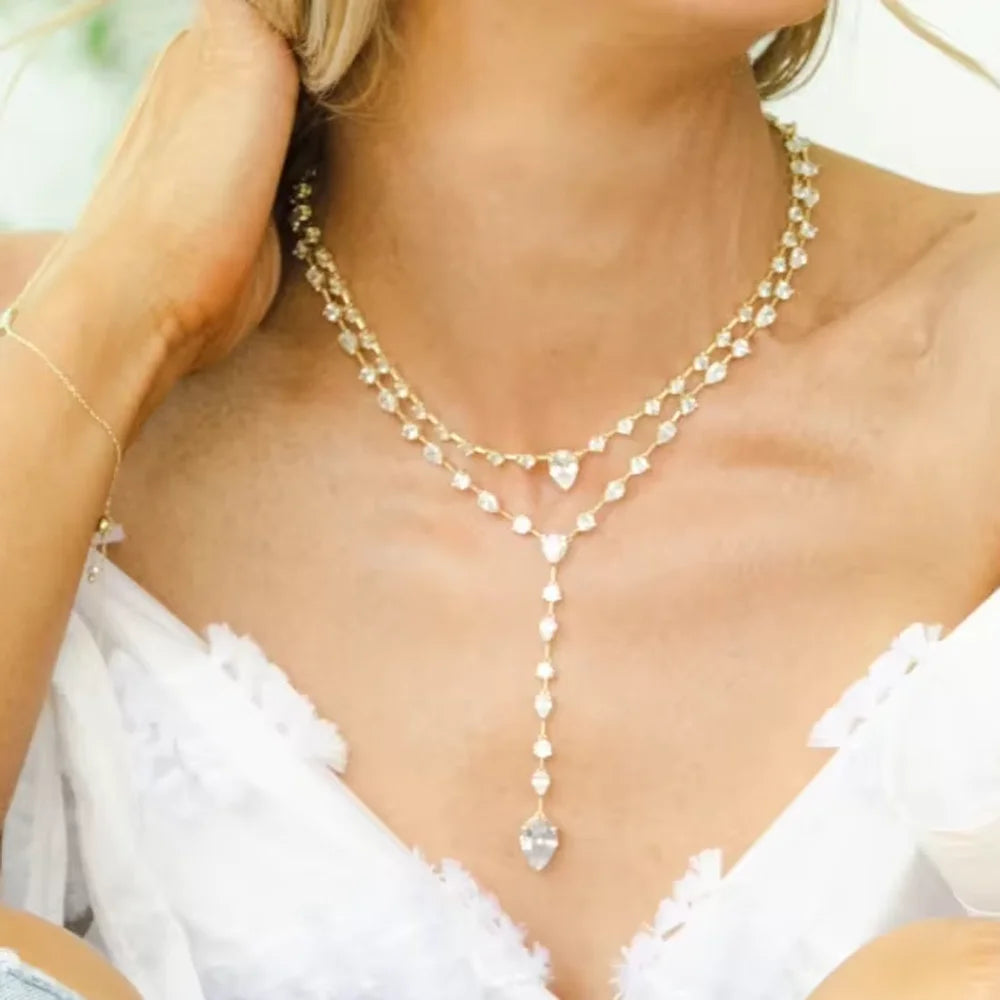 Add a sparkling touch to your look with the Green Teardrop Lariat Necklace, a dazzling fusion of elegance and trendy style. Featuring 5A cubic zirconia stones in shimmering heart and round shapes, this versatile necklace offers both choker (35+10cm) and lariat (41+5cm) styling options, letting you wear it layered or solo for a striking statement. The cross-chain design in gleaming silver or gold adds a modern twist, making it perfect for parties, special occasions, or elevating your everyday outfits.