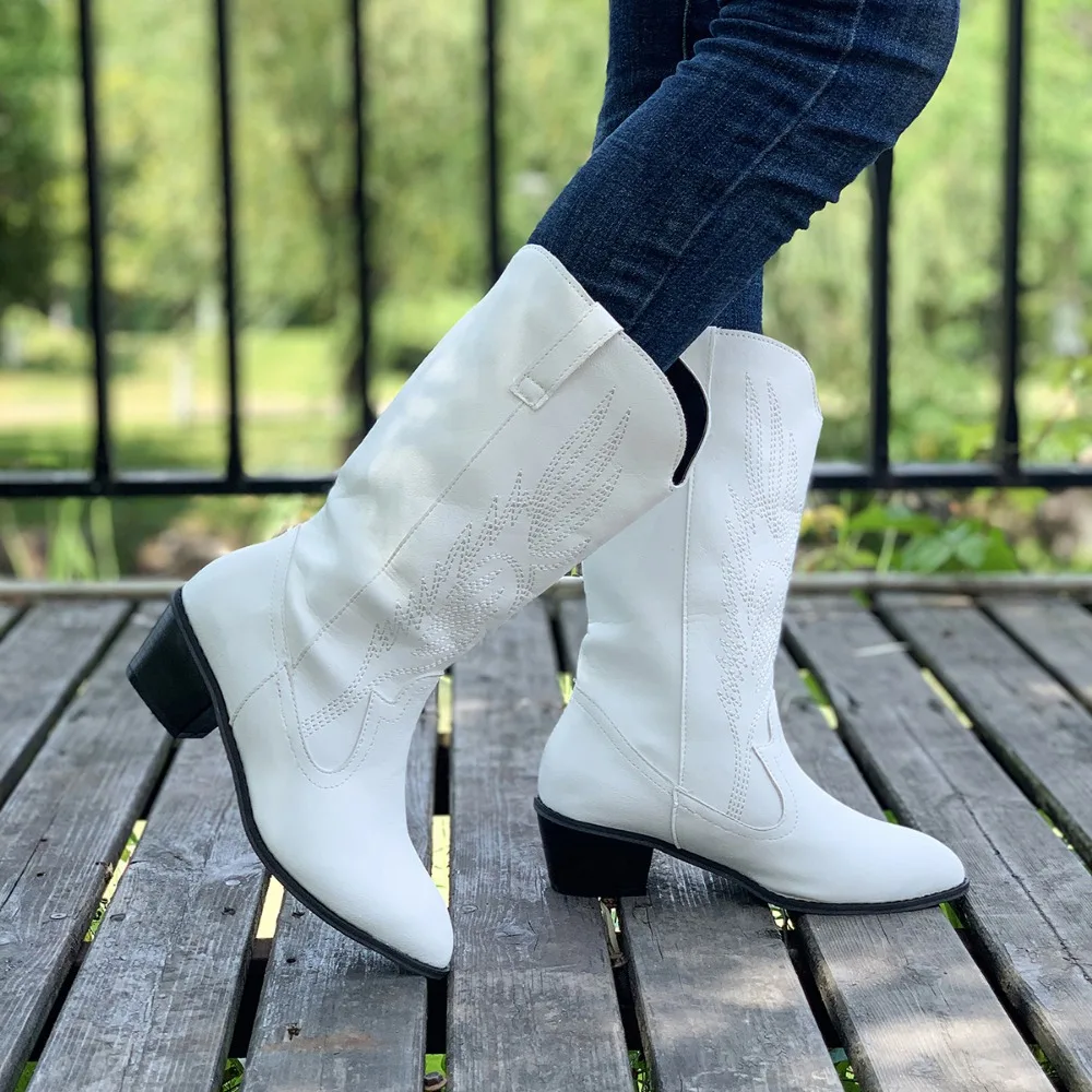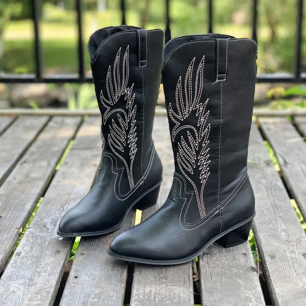 piece for winter style. Designed with a sleek pointed toe, eye-catching stitching details, and a smooth PU upper, these boots bring effortless attitude to every outfit. The slip-on design makes them easy to wear, while the solid pattern gives them a timeless edge that pairs perfectly with jeans, dresses, and everything in between.